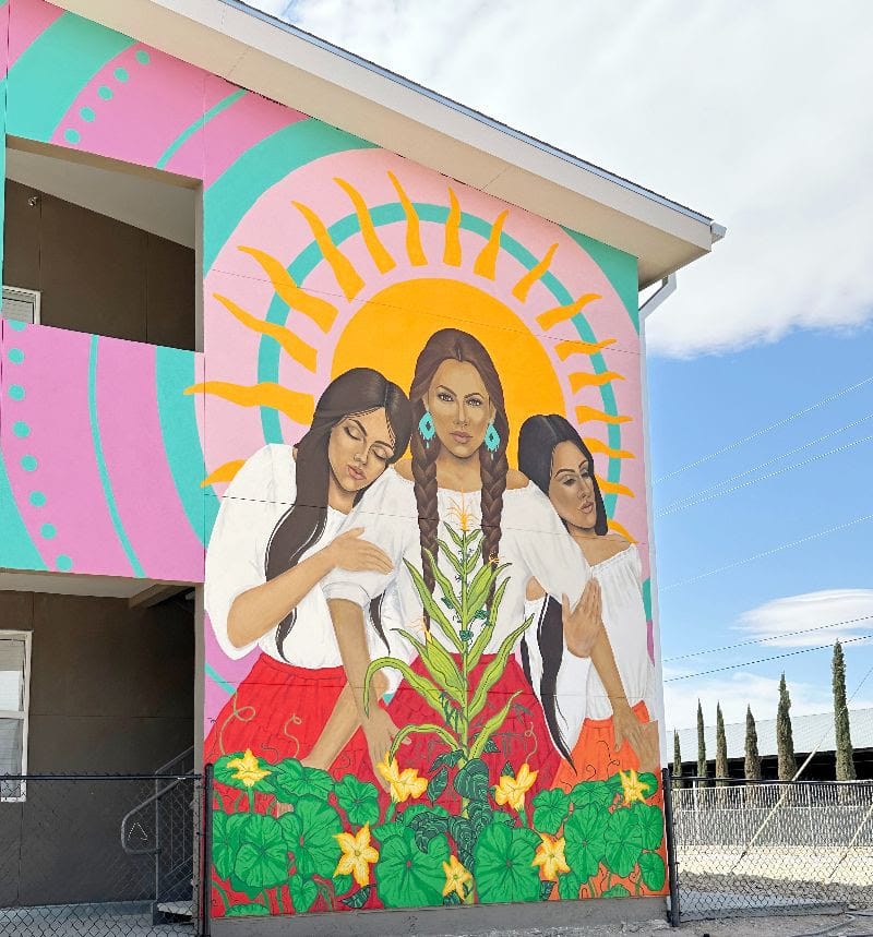 The development includes a site-specific public art piece, Las Tres Hermanas, created by Las Cruces artist Laura Anahy Núñez. Commissioned through the city’s Public Art Program, the installation draws from the Mesilla Valley’s agricultural heritage and the traditional “three sisters” crops — corn, beans and squash — which symbolize resilience, unity and sustenance.